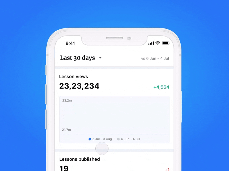 Enabling Educators on Unacademy platform with data! Educators can now see the no. of lesson views, lesson published, average ratings, followers gained and make much more sense out of this by comparing all data to previous time period. They can also see the delta between the two time periods, shown in green(increase) and red(decrease). Statistics can be viewed as lifetime, last 30 days, current month and last 7 days. Have also included a touchpoint to collect better feedback for this screen.